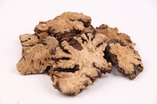 性状:本品为不规则结节状拳形团块,直径2~7cm。表面黄褐色,粗糙皱缩,有多数平行隆起的轮节,顶端有凹陷的类圆形茎痕,下侧及轮节上有多数小瘤状根痕。质坚实,不易折断,断面黄白色或灰黄色,散有黄棕色的油室,形成层呈波状环纹。气浓香,味苦、辛。稍有麻舌感,微回甜。
