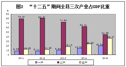 按常住人口计算,全县人均生产总值20613元,增长3.9%。三次产业结构比为19.34:44.59:36.07,与上年相比,第一、第三产业所占比重分别增加5.33、12.48个百分点,第二产业所占比重减少17.81个百分点。